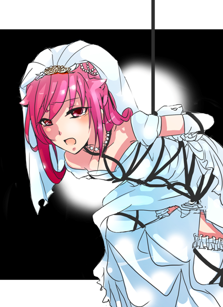 『ウエディングドレスを着たakaneko1112が束縛されて涙目になっている絵』